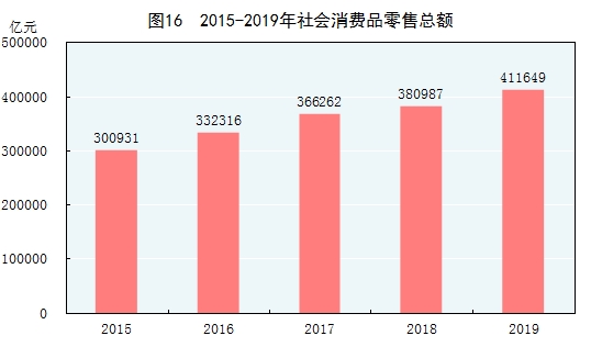 全年社會消費品零售總額411649億元,比上年增長8.0%。按經營地統計,城鎮消費品零售額351317億元,增長7.9%;鄉村消費品零售額60332億元,增長9.0%。按消費類型統計,商品零售額364928億元,增長7.9%;餐飲收入額46721億元,增長9.4%。