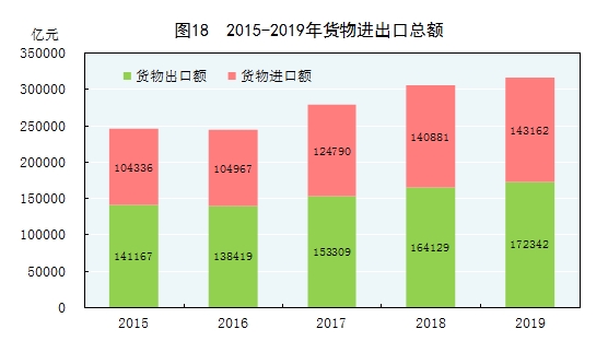 全年貨物進出口總額315505億元,比上年增長3.4%。其中,出口172342億元,增長5.0%;進口143162億元,增長1.6%。貨物進出口順差29180億元,比上年增加5932億元。對“一帶一路”[52]沿線國家進出口總額92690億元,比上年增長10.8%。其中,出口52585億元,增長13.2%;進口40105億元,增長7.9%。