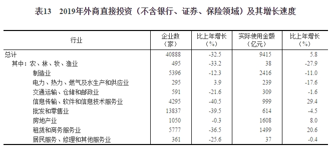 全年外商直接投資(不含銀行、證券、保險領域)新設立企業40888家,比上年下降32.5%。實際使用外商直接投資金額9415億元,增長5.8%,折1381億美元,增長2.4%。其中“一帶一路”沿線國家對華直接投資新設立企業5591家,增長24.8%;對華直接投資金額(含通過部分自由港對華投資)576億元,增長36.0%,折84億美元,增長30.6%。全年高技術產業實際使用外資2660億元,增長25.6%,折391億美元,增長21.7%。