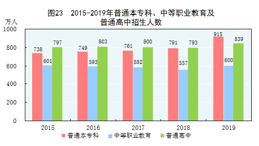 全年研究生教育招生91.7萬人,在學研究生286.4萬人,畢業生64.0萬人。普通本專科招生914.9萬人,在校生3031.5萬人,畢業生758.5萬人。中等職業教育[70]招生600.4萬人,在校生1576.5萬人,畢業生493.4萬人。普通高中招生839.5萬人,在校生2414.3萬人,畢業生789.2萬人。初中招生1638.8萬人,在校生4827.1萬人,畢業生1454.1萬人。普通小學招生1869.0萬人,在校生10561.2萬人,畢業生1647.9萬人。特殊教育招生14.4萬人,在校生79.5萬人,畢業生9.8萬人。學前教育在園幼兒4713.9萬人。九年義務教育鞏固率為94.8%,高中階段毛入學率為89.5%。