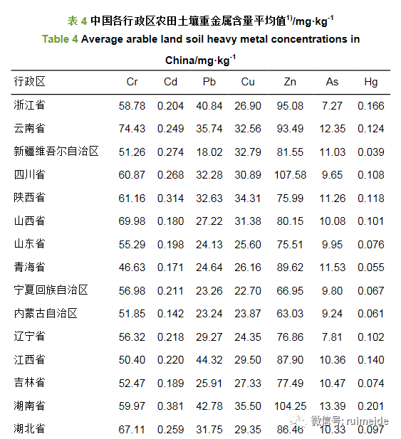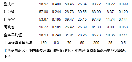 根據中國農田土壤重金屬平均含量統計,7種重金屬含量最高的行政區分別為:Cr 74.90 mg·kg-1(上海市)、Cd 0.400 mg·kg-1(重慶市)、Pb 52.48 mg·kg-1(福建省)、Cu 35.50 mg·kg-1(湖南省)、Zn 107.98 mg·kg-1(廣西壯族自治區)、As 14.17 mg·kg-1(廣西壯族自治區)以及Hg 0.225 mg·kg-1(福建省)。其中湖南、云南、貴州、四川、福建、廣西以及上海市農田土壤重金屬平均含量總體較高, 而內蒙古、黑龍江、青海、新疆、遼寧、吉林以及寧夏回族自治區的平均含量較低。
