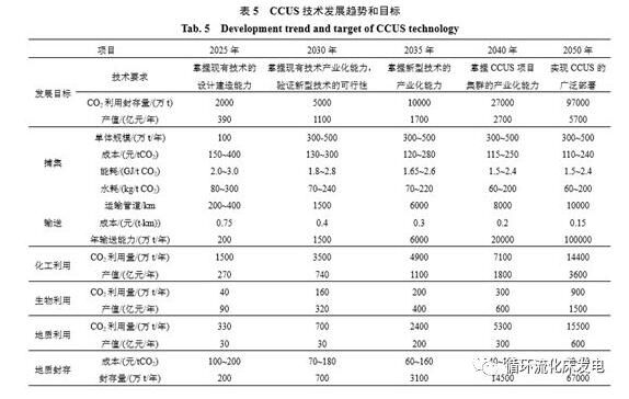 CCUS作為一項有望實現化石能源大規模低碳利用的技術,是我國未來減少CO2排放、保障能源安全和實現可持續發展的重要手段。隨著示范項目范圍擴大,未來有望建成低成本、低能耗、安全可靠的CCUS技術體系和產業集群,為化石能源低碳利用提供技術選擇,為應對氣候變化提供有效的技術保障,為經濟可持續發展提供技術支撐。根據中國21世紀議程管理中心資料,整理后的CCUS技術在我國發展趨勢和目標如表5所示。