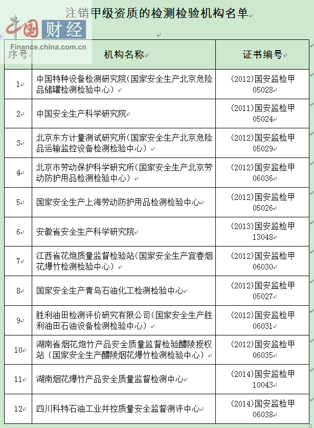 近日國家安全監(jiān)管總局發(fā)布一則公告,依據(jù)《行政許可法》和《安全生產(chǎn)檢測檢驗(yàn)機(jī)構(gòu)管理規(guī)定》(國家安全監(jiān)管總局令第12號公布,國家安全監(jiān)管總局令第80號修正)、《安全評價(jià)機(jī)構(gòu)管理規(guī)定》(國家安全監(jiān)管總局令第22號公布,國家安全監(jiān)管總局令第63號、第80號修正)等相關(guān)規(guī)定,現(xiàn)予注銷資質(zhì)有效期屆滿未申請延續(xù)或申請延續(xù)未予批準(zhǔn)的北京百靈天地環(huán)保科技股份有限公司等14家安全評價(jià)機(jī)構(gòu)、中國特種設(shè)備檢測研究院(國家安全生產(chǎn)北京危險(xiǎn)品儲罐檢測檢驗(yàn)中心)等12家安全生產(chǎn)檢測檢驗(yàn)機(jī)構(gòu)甲級資質(zhì)。