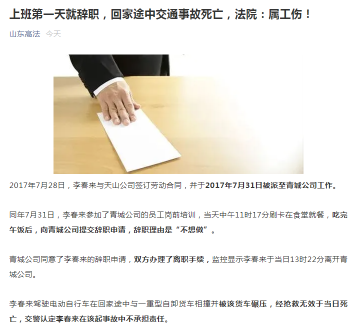 據“山東高法”微信號,2017年7月28日,李春來(當事人系化名)與天山公司簽訂勞動合同,并于2017年7月31日被派至青城公司工作。