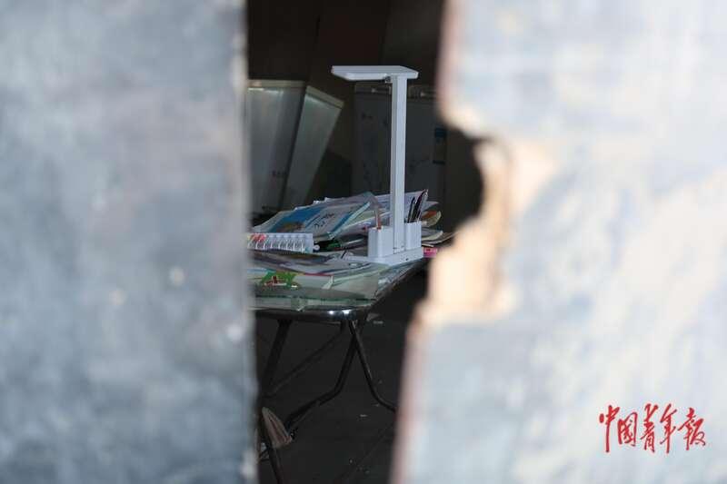1月20日,內蒙古包頭,九原區爾甲亥村,劉先生找來木板擋住玻璃破碎的縫隙,以此抵擋寒風和灰塵,透過縫隙能看到房屋內一家人居住的痕跡。中青報·中青網記者 石佳/攝