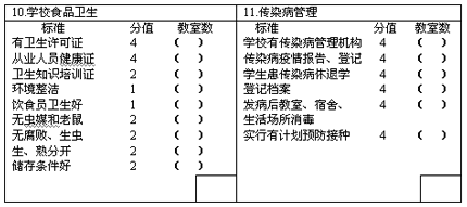 b)按評分表中課桌椅分配相符合率的標準,以及是否每人一席,將被評價的教室數填入相應的方框內,求得乘積,然后累加得積分后,再除以教室樣本數,得數為此項目得分。
