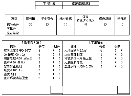 教室人均面積、課桌椅、黑板、教室采光、教室照明、微小氣候、噪聲、廁所、生活飲用水、學校食品衛生、傳染病管理、圖書館、學生宿舍、洗浴設施、體育館、旅游場所、招待所、娛樂場所。