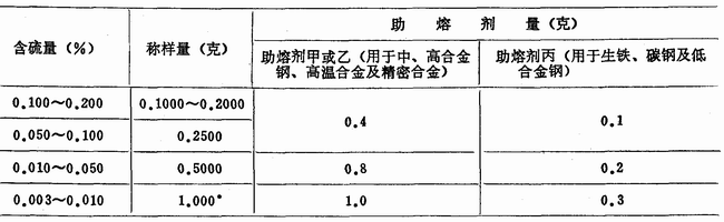 ③需用經重量法或還原一比色法定值,牌號相似,含硫量相近的標準試樣。測定0.010%以下的硫時,亦可采用稱取0.1000克含硫量大于0.010%的標樣和0.9000克含硫量小于0.001%的標樣混合后進行標定。空白值應包括瓷舟,瓷蓋,助熔劑及0.9克含硫量小于0.001%的標樣。
