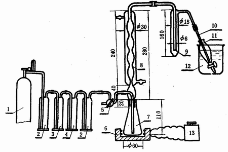 1—氮氣瓶;2—空瓶;3—高錳酸鉀—氯化汞洗瓶;4—氫氧化鉀洗瓶;5—三通活塞;6—加熱爐;