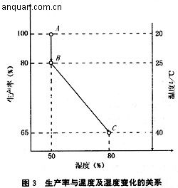 溫度環(huán)境包括溫度、濕度、風速等因素,表示方式主要是有效溫度(ET)、操作溫度(OT)、四小時汗率指數(shù)(P.SR)和濕黑干球溫度(WGBT)等。人體主觀感受的舒適溫度與人體主觀條件(運動量、穿衣多少、耐熱能力等)有關(guān)。客觀標準的舒適溫度是生理學和醫(yī)學上認為于人體最適宜的溫度:工作時為19℃~21℃。休息時為25℃~29℃。標準溫度為21±3℃。在“工作溫度”下,操作者可以安全、健康、有效地工作,故又稱為“允許溫度”。生產(chǎn)率與溫度和濕度變化的關(guān)系見圖3所示。當溫度為20℃、濕度為50%時,生產(chǎn)率為100%(A點);當濕度不變,溫度升高至25℃時, 生產(chǎn)率下降至80%(B點);當溫度升高至40℃、濕度為80%時,生產(chǎn)率下降至65%(C點)。